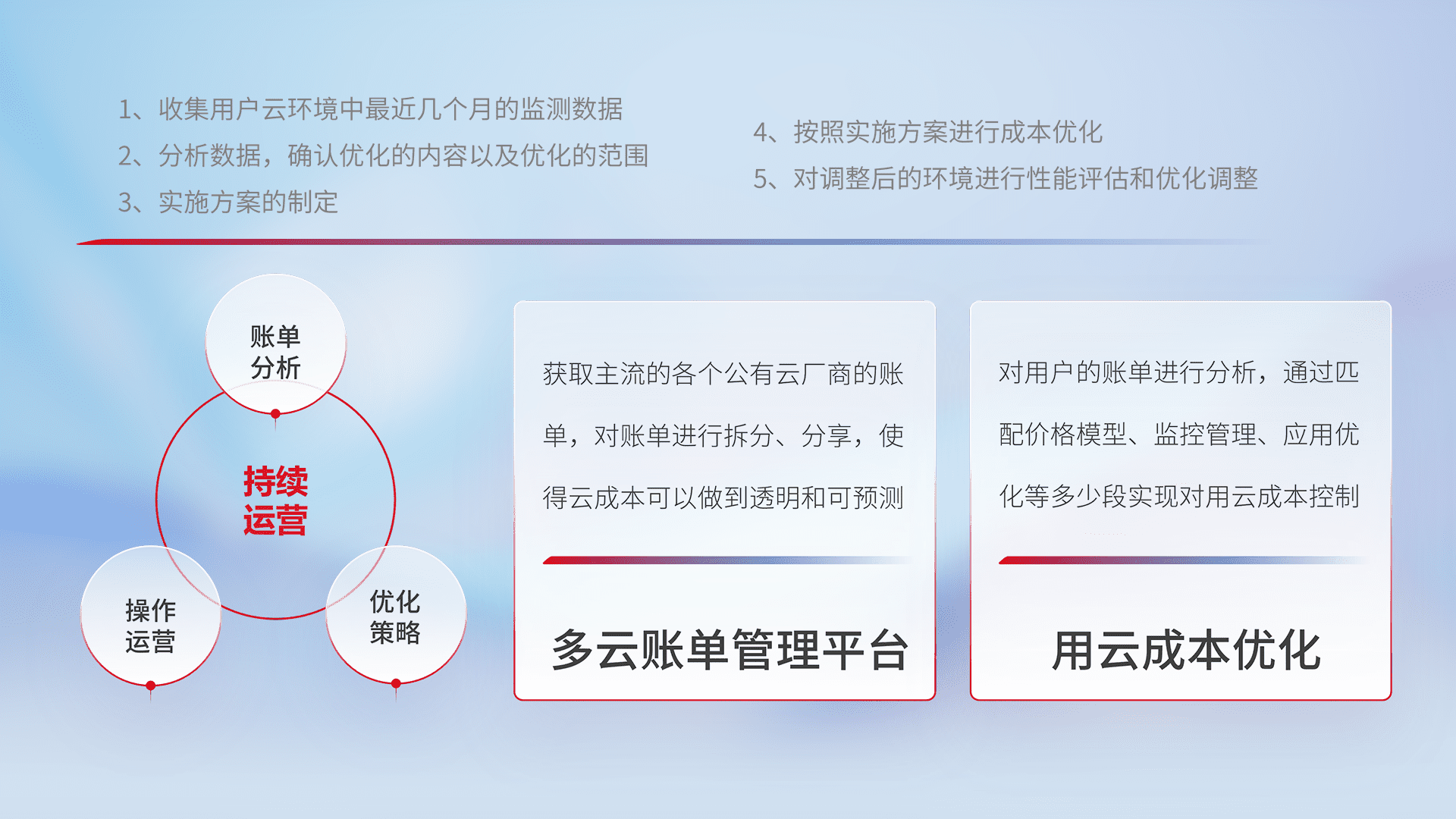 通过多云纳管,,,以统一的资源数据模型把客户的云资源进行抽象和封装,,进而实现对多云资源的统一操作,,,,保障云资源管理的可靠性、、、、稳定性与可用性。。。量身定制化运维内容,,,配置、、、开发运维、、、补丁管理、、备份、、监控、、认证和访问管理、、审计和日常巡检等,,保障在用云过程中的可靠度,,,,稳定度以及高可用率。。。